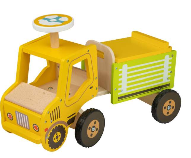 Ein stabiler Holz-Lkw zum Sitzen, Schieben und Beladen. Fördert Motorik, Fantasie und erste Rollenspiele rund um Transport und Baustelle.