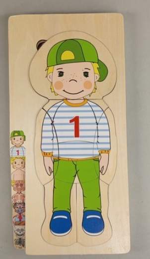 Ein kindgerechtes Puzzle aus Holz, das den menschlichen Körper in mehreren Schichten zeigt: Skelett, Organe, Muskeln und äußere Körperform. Spielerisch lernen Kinder, wie ihr Körper aufgebaut ist.